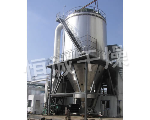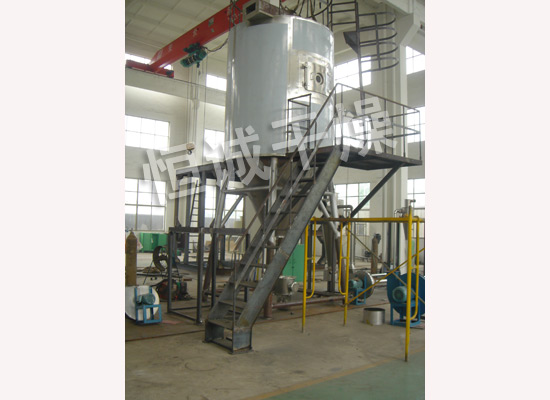 空氣經(jīng)過濾和加熱,進(jìn)入干燥器頂部空氣分配器,熱空氣呈螺旋狀均勻地進(jìn)入干燥室。料液經(jīng)塔體頂部的高速離心霧化器,(旋轉(zhuǎn))噴霧成極細(xì)微的霧狀液珠,與熱空氣并流接觸在極短的時(shí)間內(nèi)可干燥為成品。成品連續(xù)地由干燥塔底部和旋風(fēng)分離器中輸出,廢氣由風(fēng)機(jī)排空。