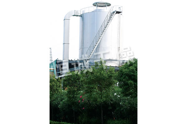 本機組工作過程為料液通過隔膜泵高壓輸入,噴出霧狀液滴,然后同熱空氣并流下降,大部分粉粒由塔底排料口收集,廢氣及其微小粉末經旋風分離器分離,廢氣由抽風機排出,粉末由設在旋風分離器下端的授粉筒收集,風機出口還可裝備二級除塵裝置,回收率在96-98%以上。